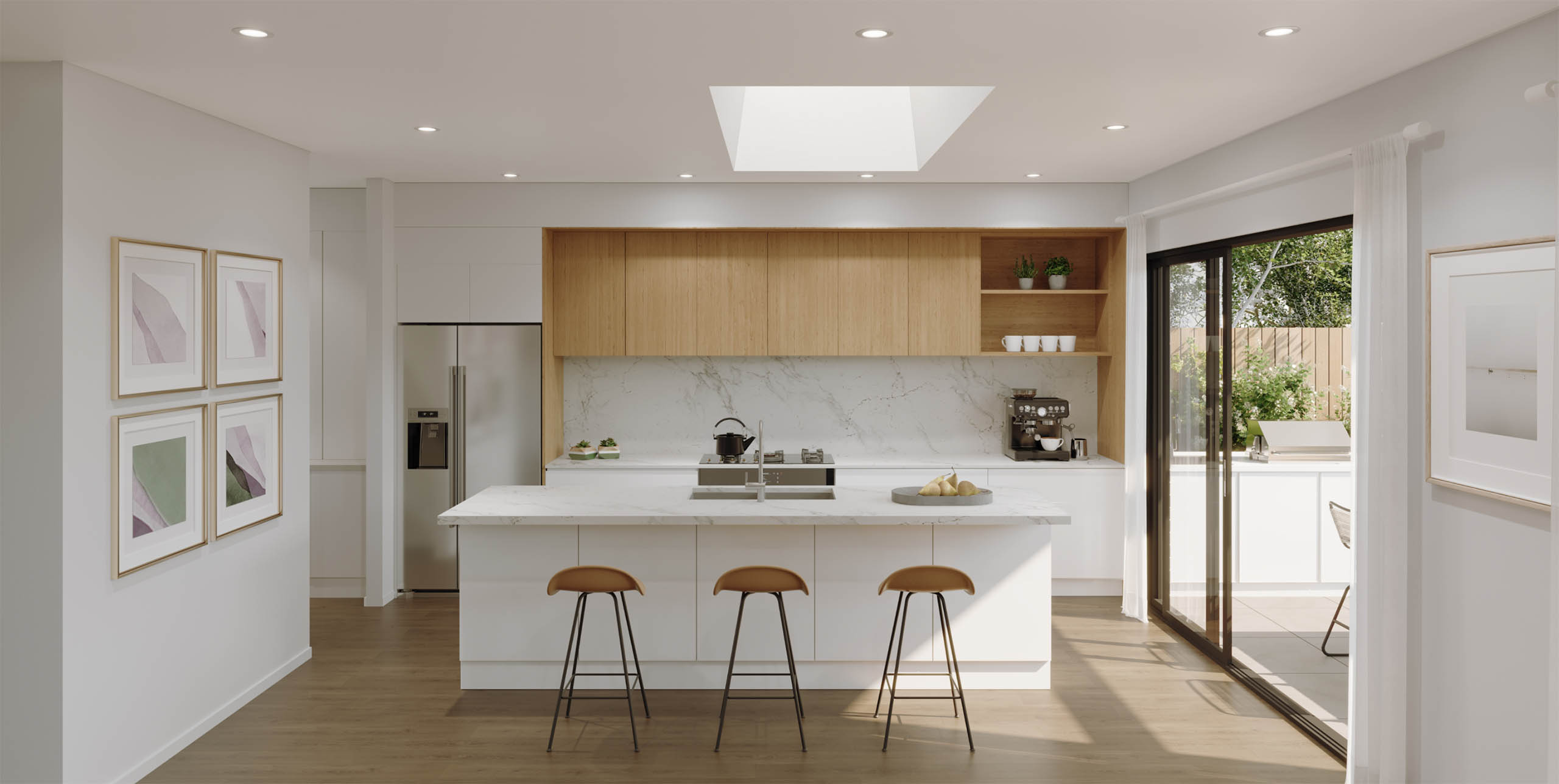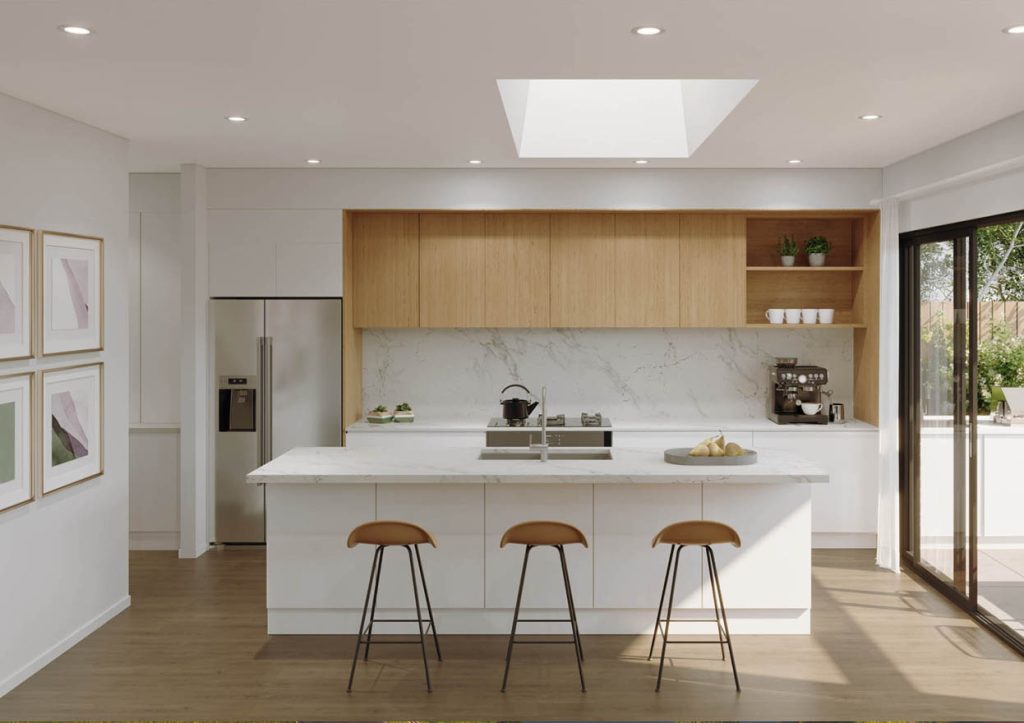 Intelligent energy-efficient architecture utilises double-glazed windows for maximum insulation throughout. With a large skylight over the island kitchen, there is a focus on making the most of available light. Coupled with large glass sliding doors to the alfresco area, the natural light and insulation creates a feeling of warmth and ambiance, no matter what the season.